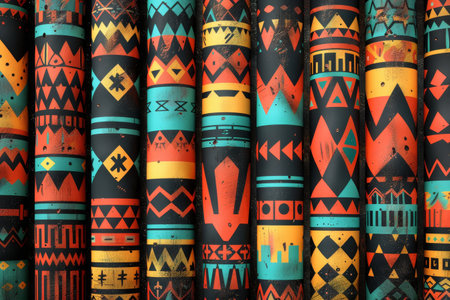 Artistic photo of a series of small timber totems lined up, each featuring unique cultural symbols. AI generated.