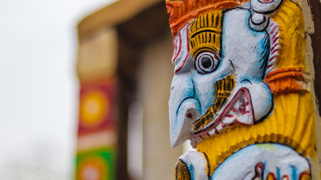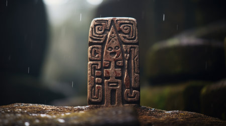 AI Generated. Intricately carved wooden totem pole representing indigenous culture with a blurred background