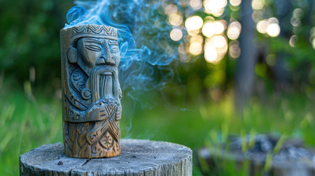 A beautifully carved wooden sculpture blends seamlessly with the natural environment, releasing delicate smoke. This enchanting scene evokes tranquility and harmony, perfect for artistic inspiration.