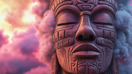 A tiki mask with a serene expression in solid color background --ar 3:2 Job ID: 4c927268-38d3-4e23-8273-12ee05dc3aca
