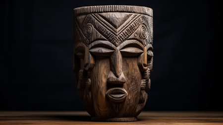 african tribal wooden pottery with intricate carvings of a human face. weathered and aged, showcasing its historical significance. placed on a dark wooden pedestal, studio lighting highlights its textures. high-resolution photograph captured with a 70mm lens to capture intricate details. ai generated