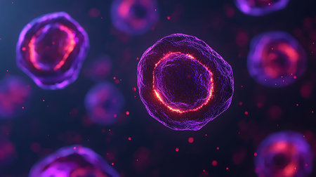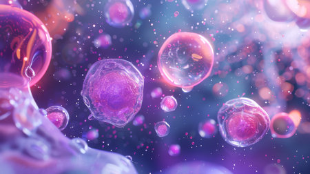 Stunning closeup of vibrant cells floating in a dynamic environment. Perfect for science and health themes, emphasizing exploration and microscopic beauty in biology.