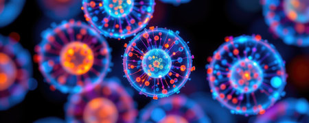 This vibrant, detailed image showcases abstract viral structures set against a dark background, emphasizing science and technology in health and research.