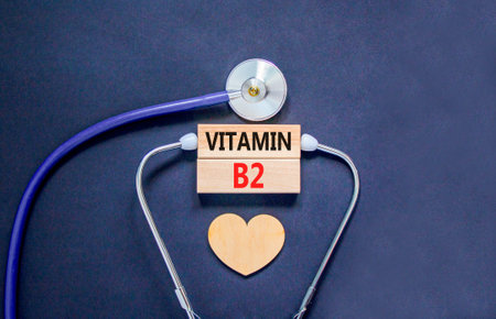 Vitamin B2 riboflavin symbol. Concept words Vitamin B2 on beautiful wooden blocks. Wooden heart and stethoscope. Beautiful black background. Medical healthy lifestyle Vitamin B2 riboflavin concept.