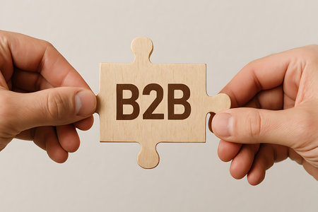 Two hands hold a wooden puzzle piece with B2B letters, representing business to business model.