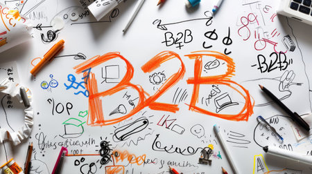 Hand-drawn orange B2B doodle on white paper, symbolizing business-to-business commerce and networking