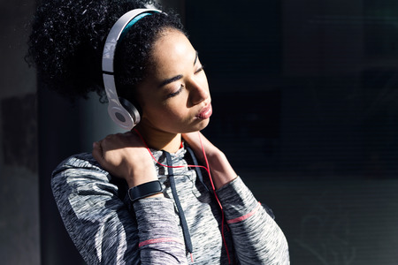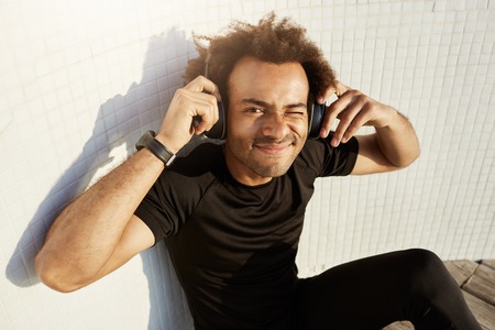 Squinting face of African-American young athlete sitting on a pier after doing exercises by the sea in black sport clothing. Athlete with big headphones on resting after jogging