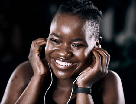 Shes found her inspiration. an attractive young female athlete listening to music while standing in the gym.