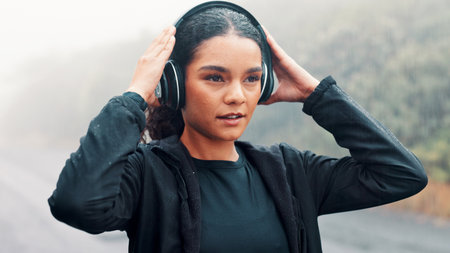 Fitness, rain and woman with headphones outdoor to start running, music playlist and cardio podcast. Athlete, person and ready for exercise in road with audio streaming, wellness workout or raindrops