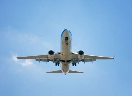 Under view of airplane flying. Commercial airline flying on blue sky