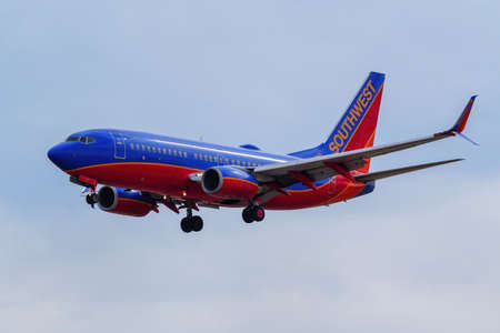 Boieng 737 operated by Southwest landing at Denver International Airport, Colorado. Southwest Airlines was founded in 1966.