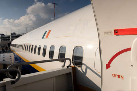 Airplane ready for boarding in a airport hub.
