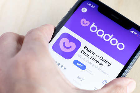 Young woman holding a smartphone with a Badoo dating app on screen. IPhone 11 with a social media chatting and meeting new people app logo.