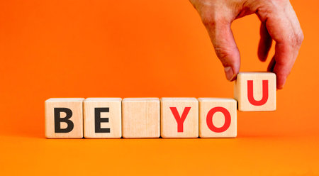 Be you support and help symbol. Concept word Be you on beautiful wooden blocks. Beautiful orange background. Psychologist's hand. Business be you support and help concept. Copy space.