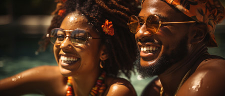 Young African American couples enjoying themselves in a hotel resort's pool. a summer break,