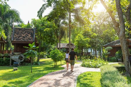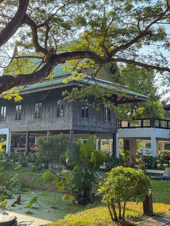 NAKHON SI THAMMARAT, THAILAND-AUGUST 30,2020 : Beautiful landscape architecture featuring traditional wooden Thai stilt house at Baan Khun Rathwutvicharn ancient House, Thai historical heritage site