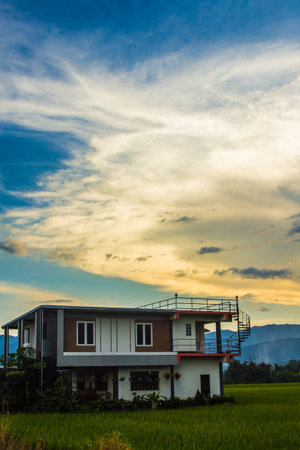 house surrounded by nature surrounded by mountains and trees. Feel the freshness without pollution. Dream house fog in morning