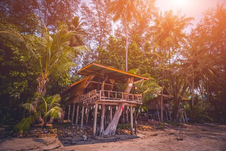 Aerial view of wooden resort homestay on hill in tropical rainforest on rural village at countryside