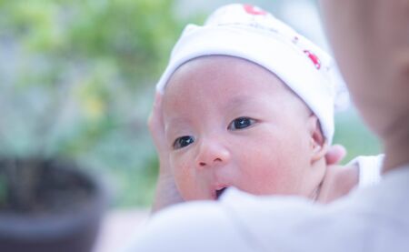 Portrait of a newborn baby infant hold close by mother in the garden, close up. Family,