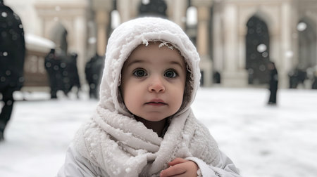 a small child wearing a white coat and scarf in the snow, looking at the camera with one eye open