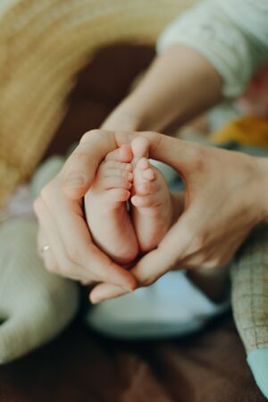 Baby feet in mother hands. Mom and her Child. Beautiful conceptual image of Maternity