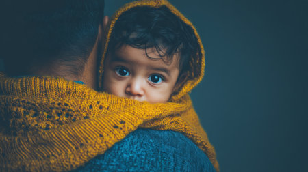 A heartwarming image showcasing a parent holding a child wrapped in a cozy yellow shawl, highlighting the bond of love and trust in a serene setting.