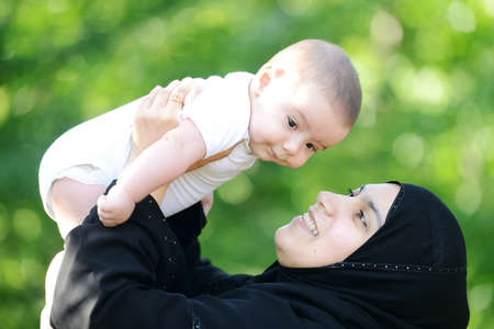 Little toddler kid in hands of her mother, Happy Muslim family. Baby boy pointing with his finger to upwards showing something to her mother. A Muslim mother in hijab having fun with her kid