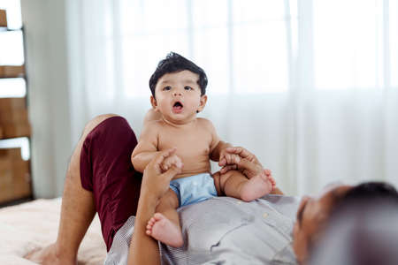 Young father does massage and useful exercises with little baby son on bed in bedroom