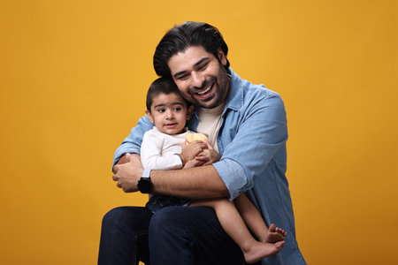 Portrait of a handsome young Indian man with his son isolated over yellow background
