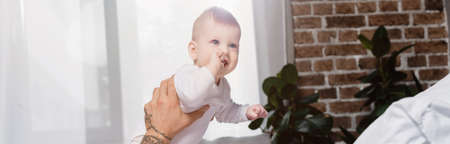 selective focus of young father holding excited baby boy looking at camera with open mouth, panoramic concept