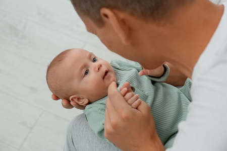 Father holding his cute baby indoors, above view