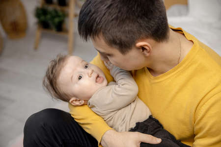 Cute one-year-old child looking at his father and smiling. A young father holds his one-year-old son in his arms.