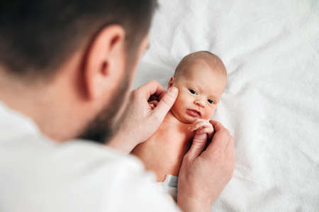 Newborn baby and young dad close up. Baby care concept, newborn weight, diapers, napkins, temperature, bilirubin ...
