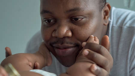 Black father playing with baby feet. Close up. High quality photo