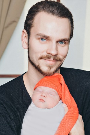Happy family: a close up portrait of young dad holding his cute newborn baby