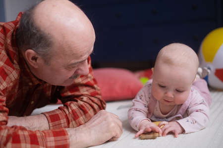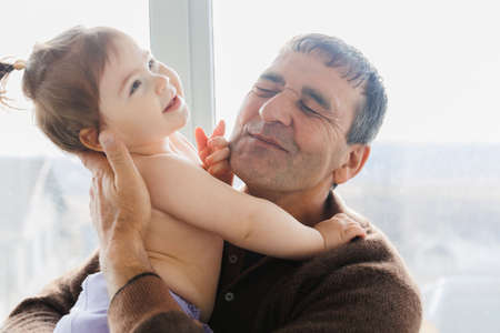 Senior elderly man playing to his baby granddaughter, holding him in the air. Two age generations family old grandparent and small grandkid enjoying activity together.