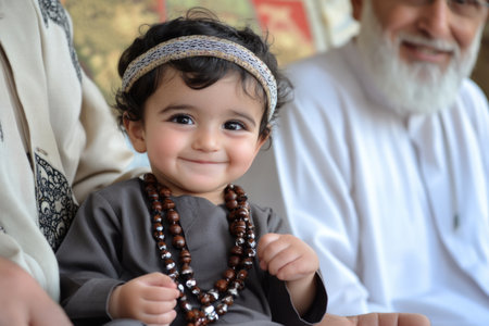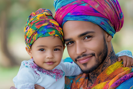 Happy father and daughter wearing bright traditional turbans smiling outdoors in warm light.