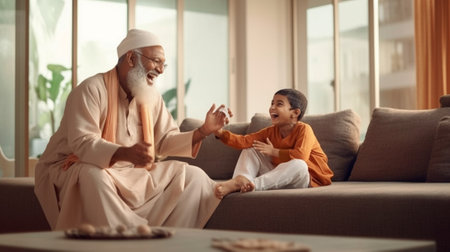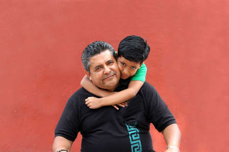 Single latino grandfather and grandchild play and have fun together spending quality family time on Father's Day celebrating victory with hugs and kisses