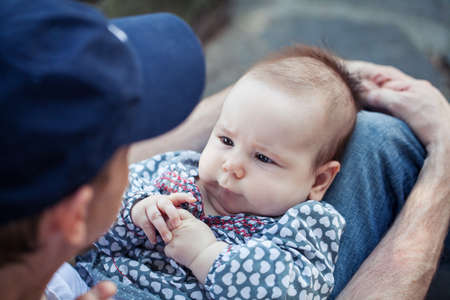 Cute little baby boy in his fathers arms. Dad and son having fun on sunny summer day in city park. Adorable son being held by his daddy.