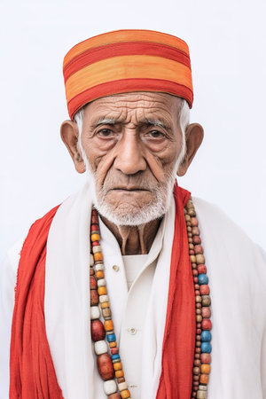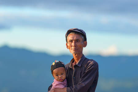 Phongsaly, Laos - november 2, 2019: portrait senior Akha man holding child wearing traditional hat belonging to minority ethnic group living in hilltribe villages around Phongsaly, North Laos.