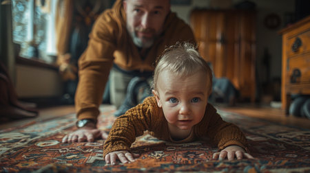 This heartwarming image captures a joyful father holding his infant with warmth and affection, highlighting the beautiful bond between them in a cozy indoor setting.