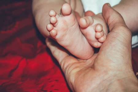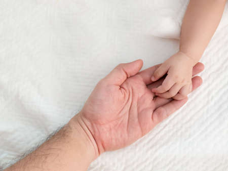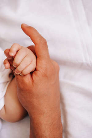 Closeup of father holding baby hand on white sheet. Happy fatherhood