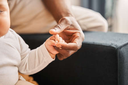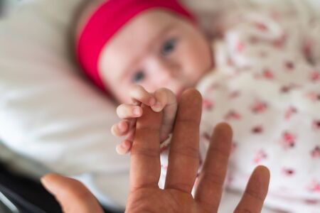 Infant hand gripping adult finger. Selective focus background. 6mont old lying on bed and holding fathers finger.