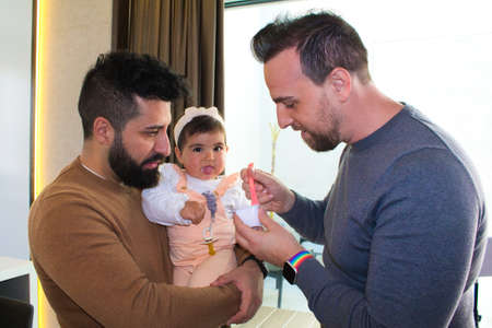 gay couple are changing their daughter's nappy on the changing table. They are booth looking at the baby child smiling and one of the fathers holds his nose because of the bad smell