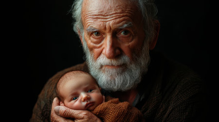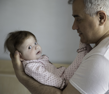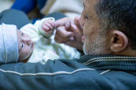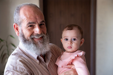 Grandfather holding baby with smile on his face, grey beard, baby holding finger