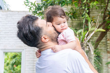 Cheerful father holding and kiss baby daughter in his hand while relax time at home. Mixed race little lovely girl with daddy carrying in the garden . Happy father day concept.