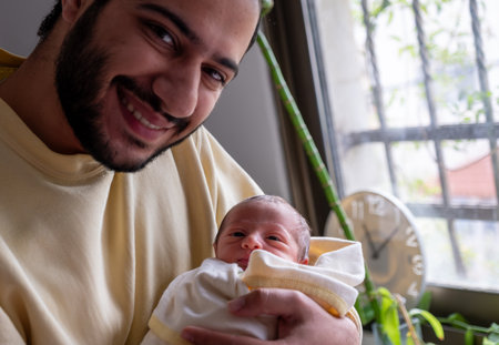 Father holding his newborn son with cheerful reaction and smile on his baby face