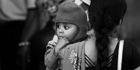 JAIPUR, INDIA Ð MARCH 4: An unidentified child held by his mother outside the City Palace on March 4, 2012 ahead of the annual Holi Festival in Jaipur, Rajasthan, Northern India.