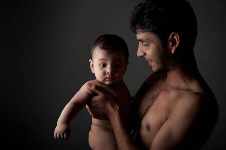 Young father hugging his little son and looking at him lovingly. Studio portrait on black background.