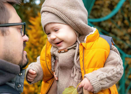 Cute toddler boy in his fathers arms. Dad and son having fun on sunny autumn day. Adorable son being held by his daddy.